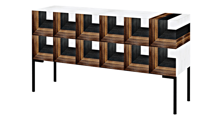 专家木大师精心设计这一块,一个精致的木装饰重建三维光学错觉。 树林里使用乌木、紫木香木材,木灰和增白桑托斯在内部块珍贵的红木。 拉长了一下铁腿黑色不透明涂饰剂完成这个引人注目的对象,为任何空间带来了永恒的魅力.
