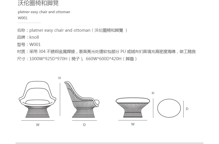 在1960年代,沃伦Platner钢丝变成了雕塑家具收集、创建现在被认为是现代的设计图标。 Platner收集独特的和谐的形式是由焊接钢线材圆形镜框,生产波纹效应和捕捉装饰、温柔、优雅的品质Platner试图实现。 手的安乐椅上,一个流行的雕塑图标削几何形状和颜色,是弯曲的舒适的缩影;它可以有或没有脚踏,也可以单独使用。