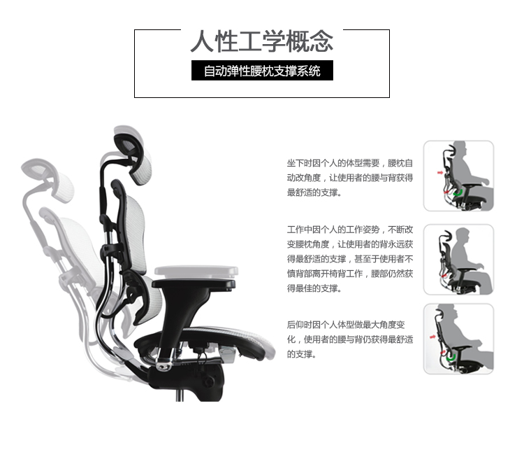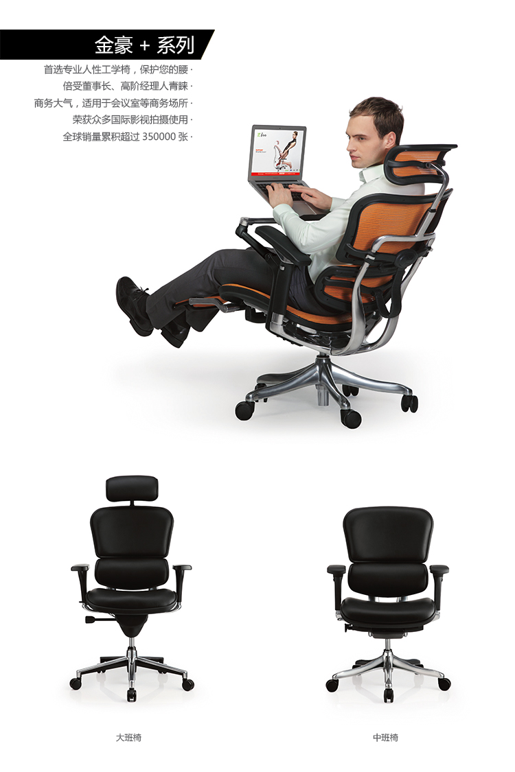 全球首创的单杆式操控底盘,一根杆操控所有功能,使办公椅的操控更加人性化;自动弹性腰枕支撑系统,无论是在坐下时、工作中、或者后仰时,都能让使用者的腰和背获得最舒适的支撑;金豪+系列采用完全性多功能调整设计,从头枕、椅背、扶手与座垫可进行全方位的调整