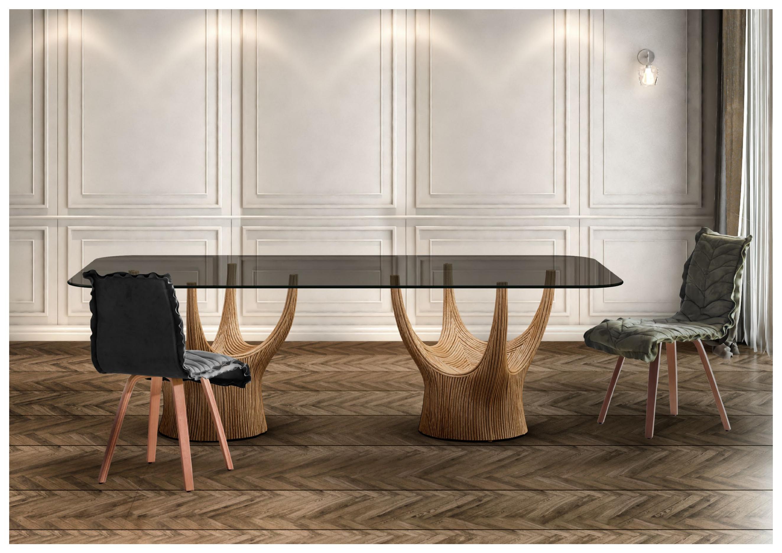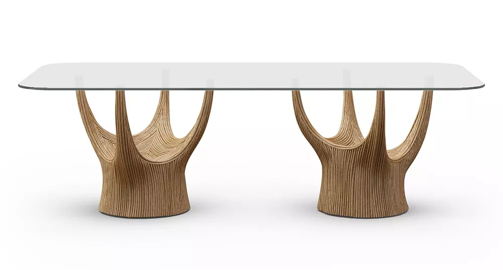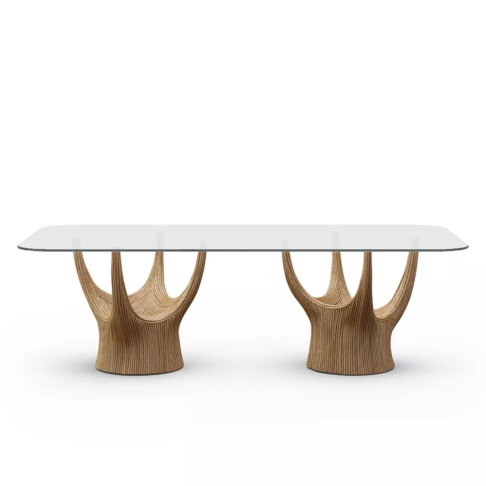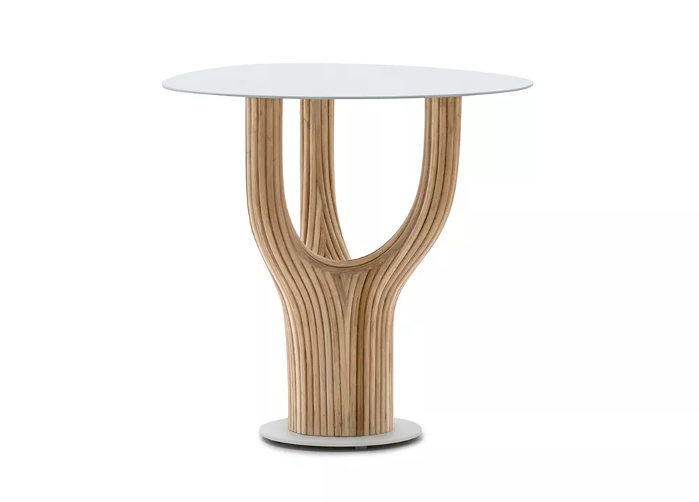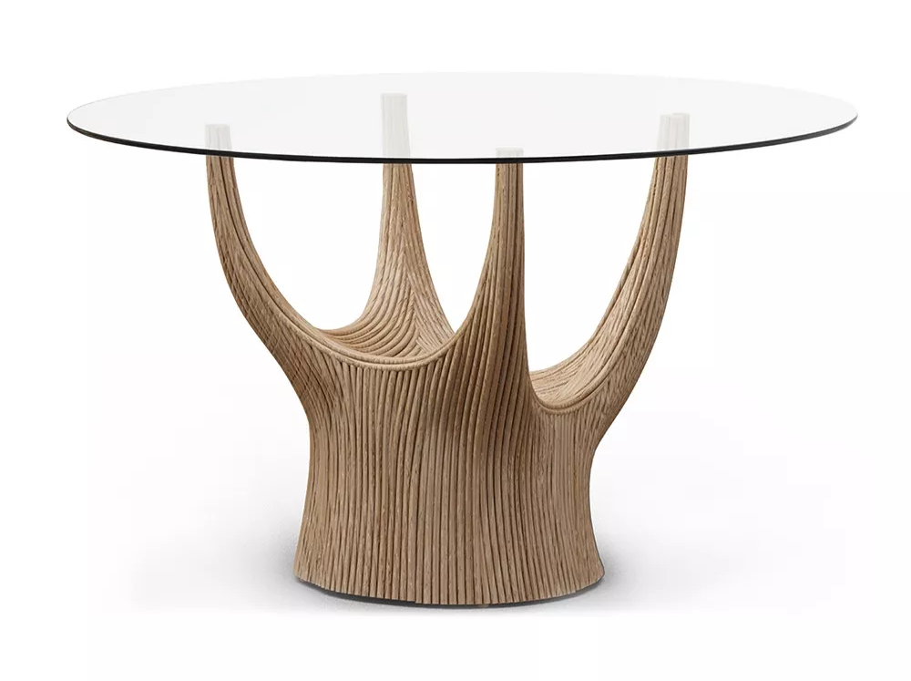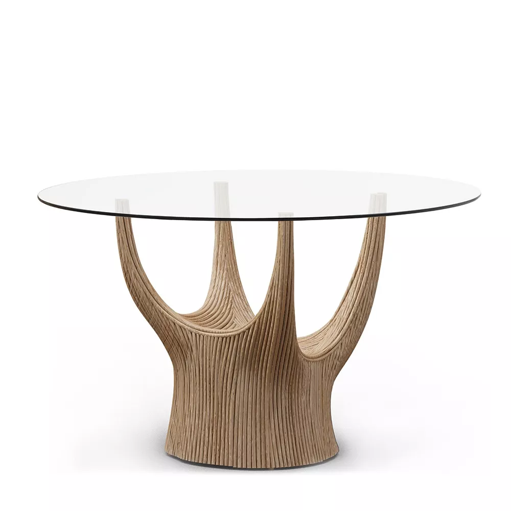 acacia藤制桌子系列的灵感来自古老的猴面包树,由藤杆固定在一起,创造出雕塑般流畅的轮廓。自然原始的藤条组合与更为流线型和简约的桌面形成鲜明对比。