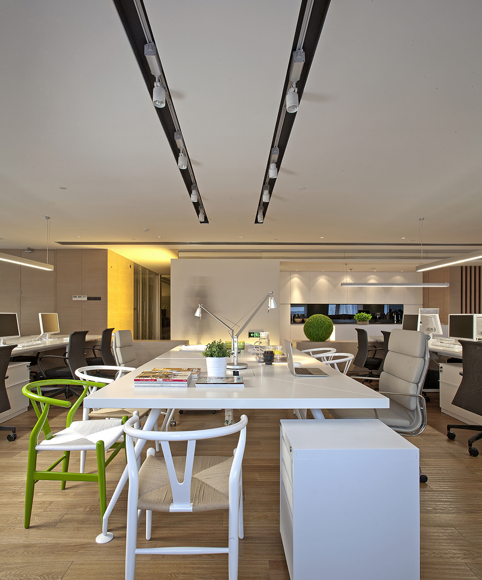 无论是下沉式设计部,开放式茶水间或者储书方式,灯光,家具,都是在构建聚落式场景,减少对着电脑呆滞的时间,能更随性的阅读书籍,调试衣物板式,选择物料,同时交流,分享设计。良性的工作环境,良性的竞赛及分享意识。