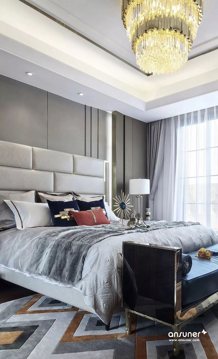 主卧组合了丝绒面料、马毛地毯、精致水晶、尊贵皮质等现代元素,呈现出品质生活的现代追求。设计灵感来自被誉为不夜城的“New York City ”,并巧妙介入都会元素,塑造出让人迷恋的简洁、奢华与雅致,让我们仿若置身纽约曼哈顿,沉浸在时尚优雅的都市氛围中,享受现代人心之向往的自由与洒脱。