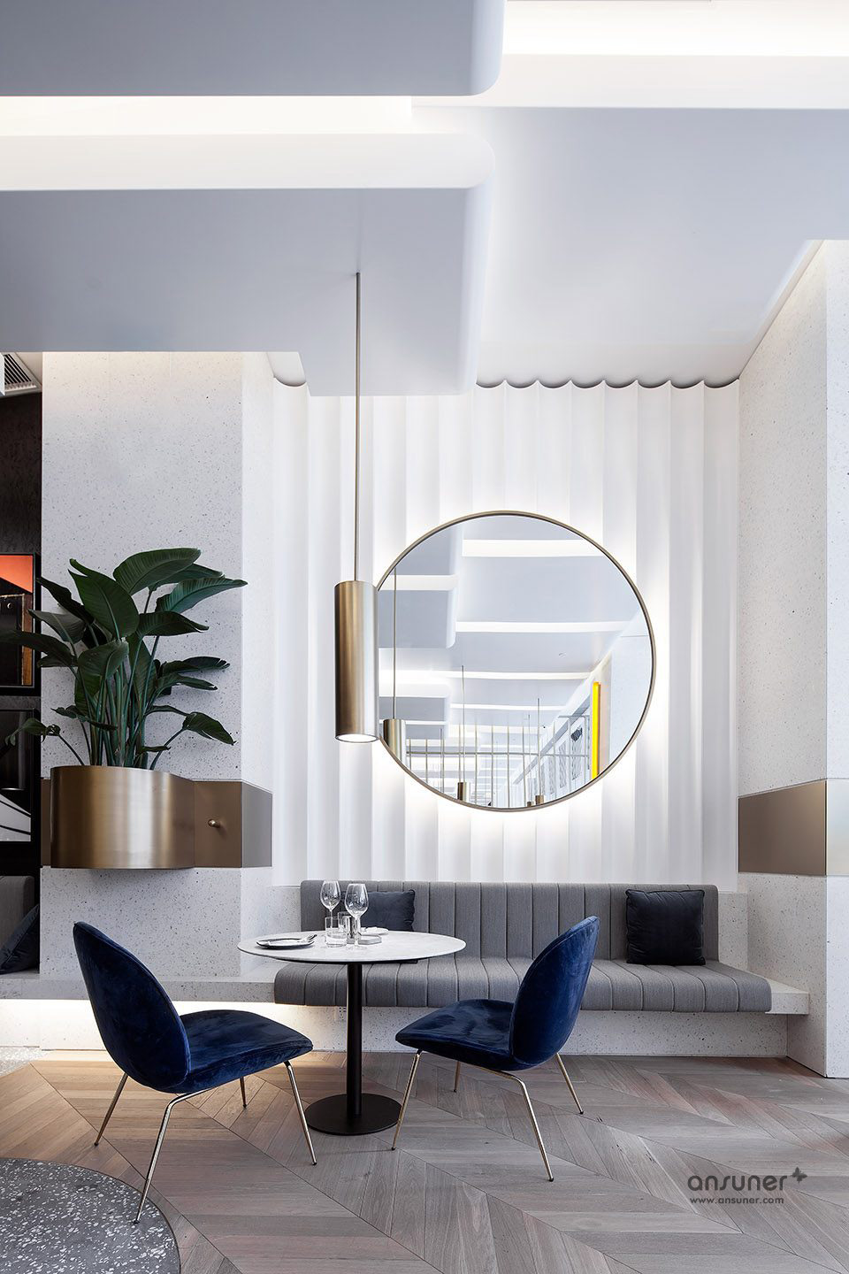 将这些自然元素同时搭配运用,更显颓废低调的处理,却无疑将整体氛围营造出了具有现代感的审美体验。例如,除了具有米黄、冷灰、浅棕等中性色调的长沙发外,舒适的吧区沙发椅使用了翠绿和午夜蓝的奢华色调,暗示着空间在晚间的氛围变化。当夜幕降临时,GAGA Chef的酒吧休闲区将会从优雅的咖啡沙龙变身为适宜餐后饮品与鸡尾酒的亲密空间。