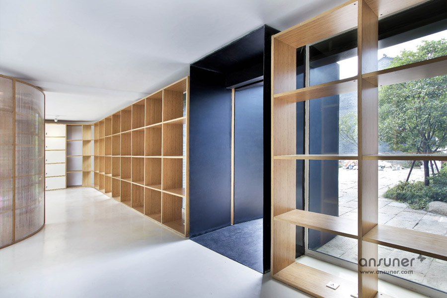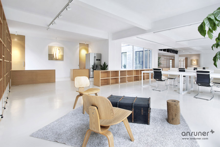 该办公室内装设计项目位于浙江省杭州,虽然基地拥有良好的室外自然景观条件,但原有建筑内部阴暗压抑:已有结构的1层层高3.3m ,梁下高度2.6m, 空间比例相对低矮;2层空间的高度具有优势,但1,2层的联系较弱,原有建筑的双层特点也并没有展现出来。