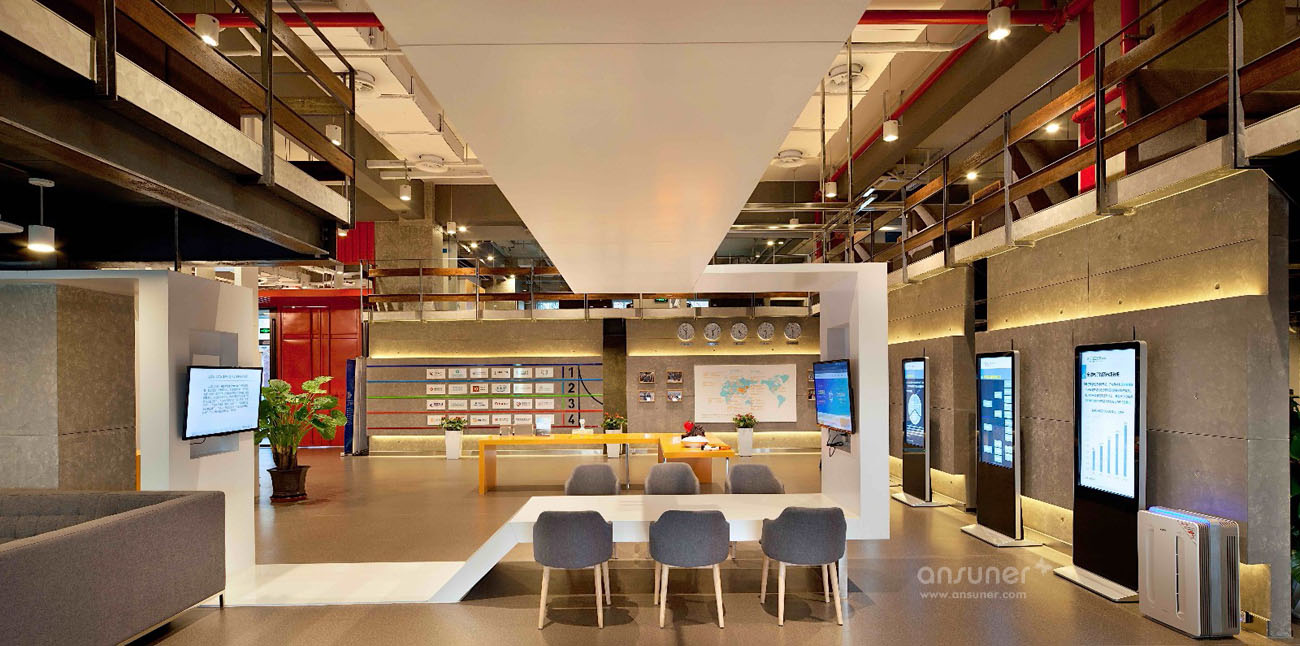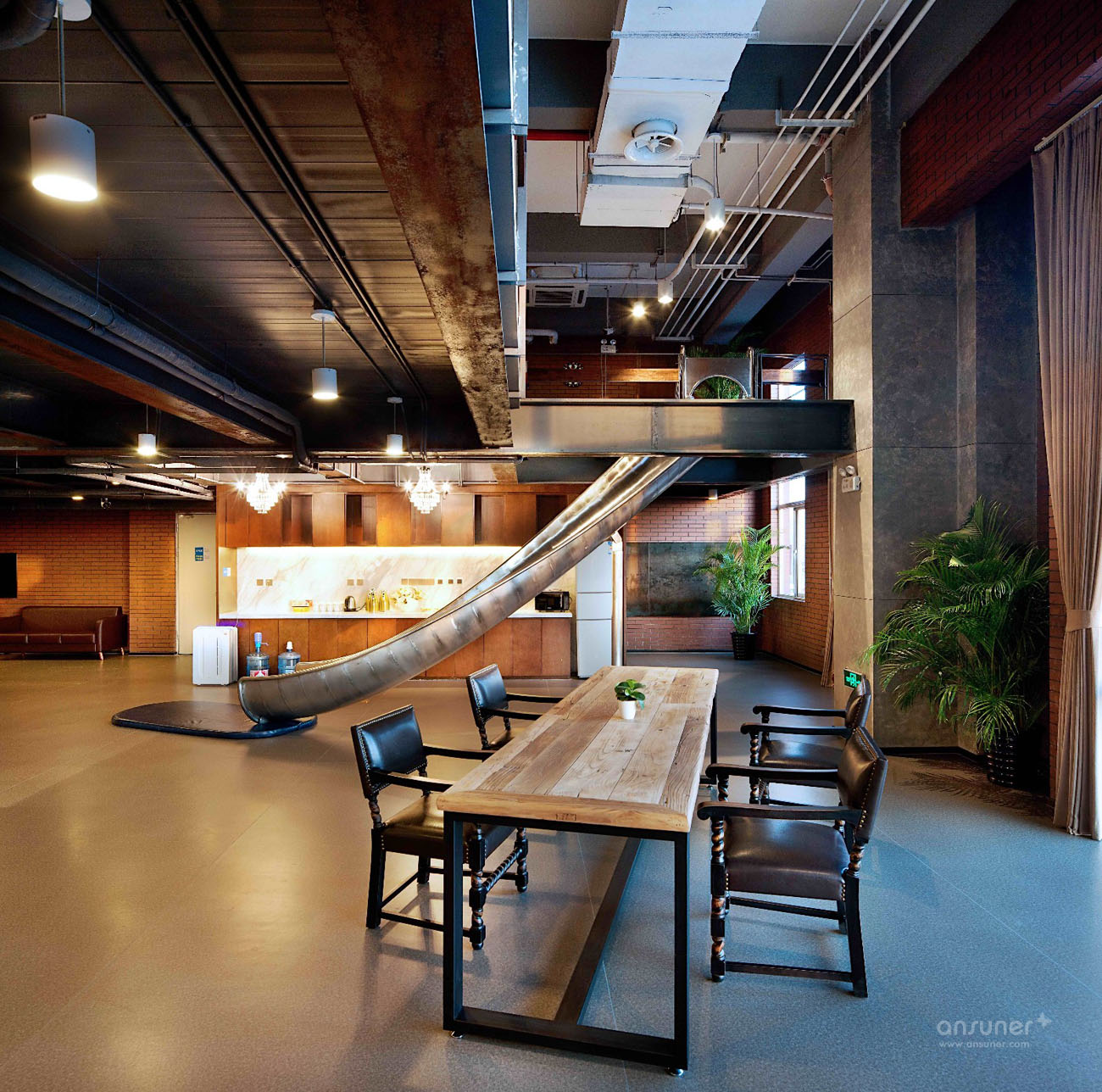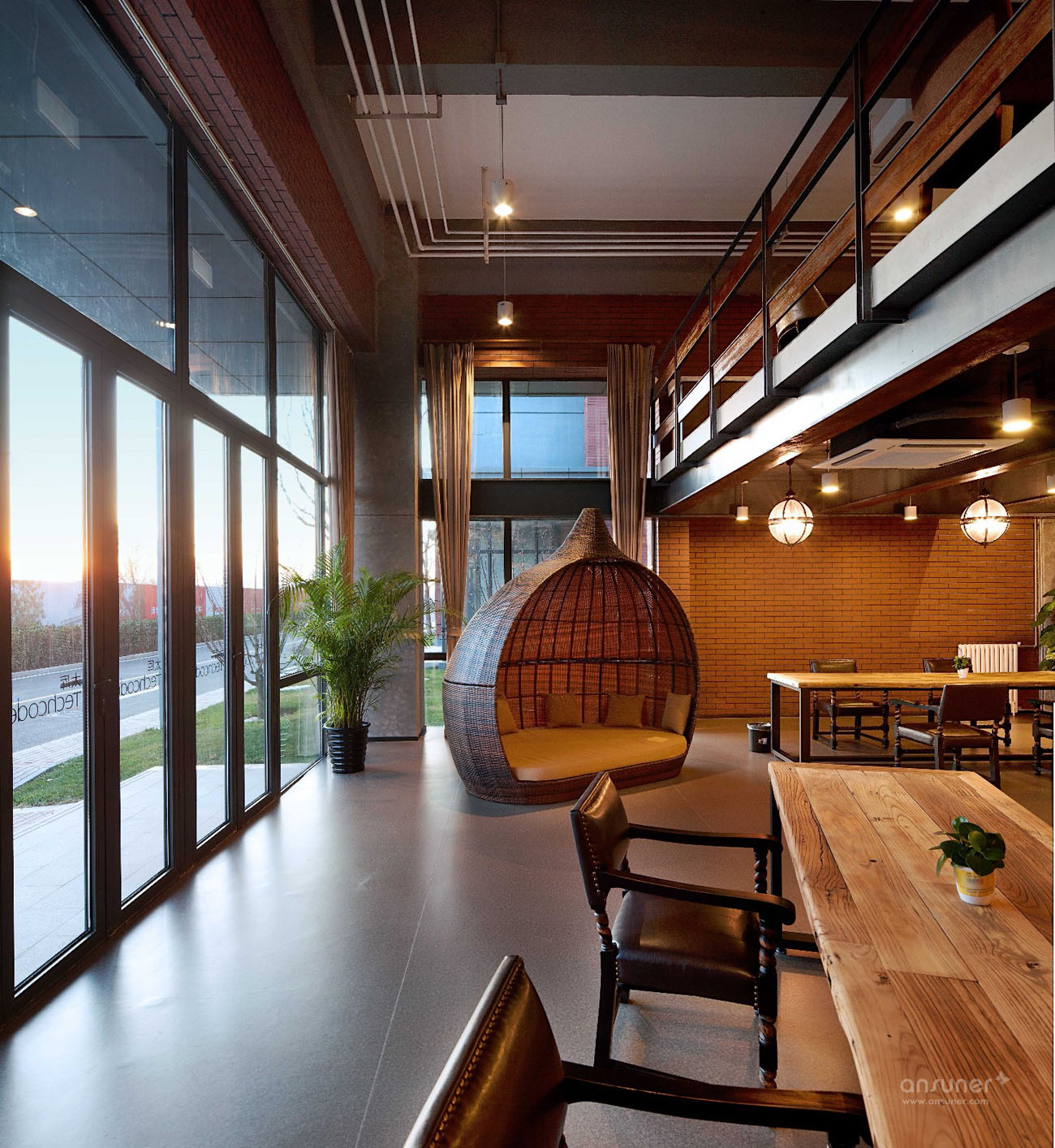 入口处醒目的大红色门厅,墙壁饰面采用集装箱纹理,与接待台后的木色饰面即形成了鲜明对比,同时又烘托出了温暖、开放的环境氛围,独特的工业风格特色让人第一眼就留下深刻印象。铁制的接待台经过特殊锈化处理,展现出了斑驳仿旧的视觉效果。