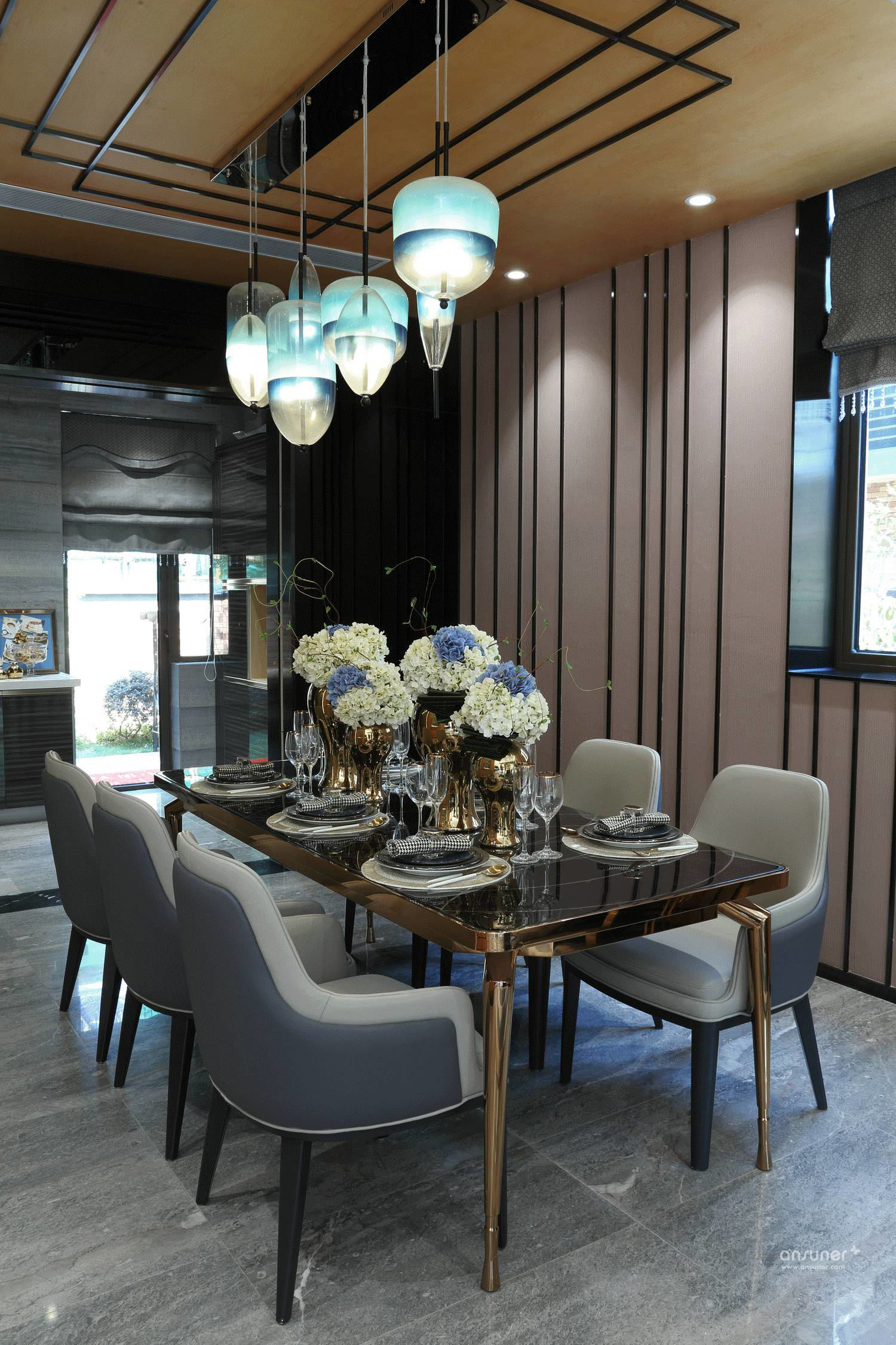 餐厅的湖蓝色水滴椭圆形吊灯,不仅柔化了天花方形线条的硬朗,也暗合中国传统文化“ 天圆地方”的朴素哲学。