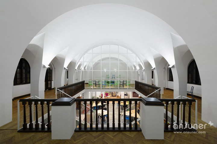 灵感的触动对于一个设计师,思考者来讲非常重要,IImpact Hub专业提供独特的系统资源、灵感和合作服务,帮助他们快速成长。教堂形的两层建筑大厅,分成三个双柱廊式拱券通道,并覆盖着大大的拱顶。因为功能需求,重新规划空间组织,一楼包括四间办公室、两间会议室、两个电话亭、厨房和厕所。所有这些功能都围绕中心共享工作空间而设。二层的平台,即可用作工作空间亦可在灿烂的夏日用作社交活动。