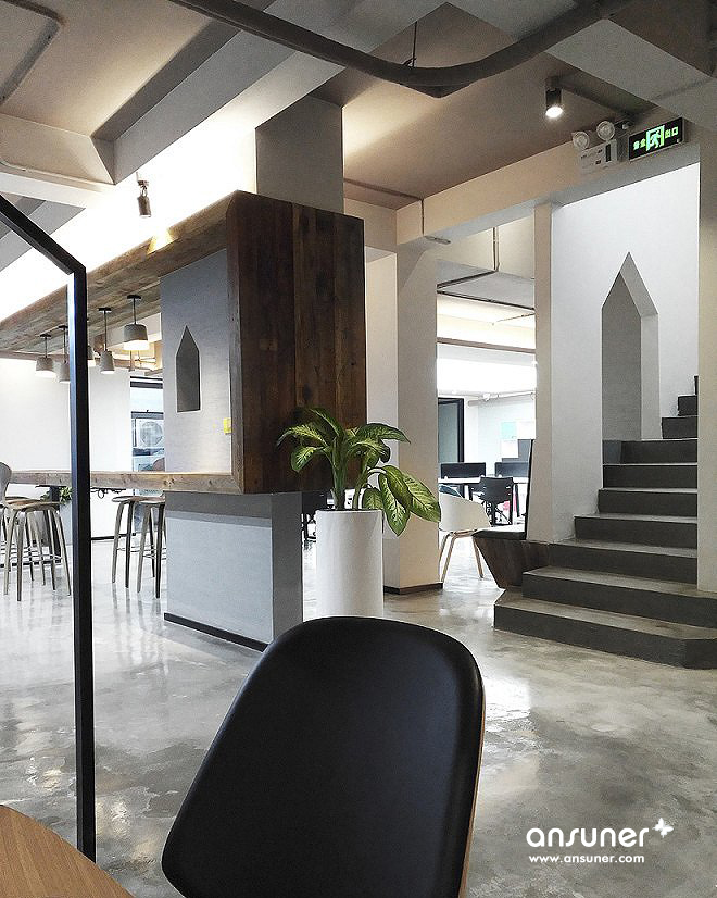 整体呈现出工业的样貌,搭配绿植景观设计,在拘谨与放松之间达成一个舒适的平衡点。
