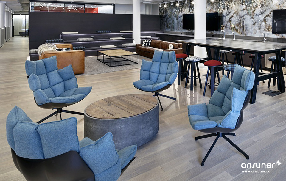 各式座椅、沙发、小凳、茶几和桌子可自由重组布局满足不同的团队需求。