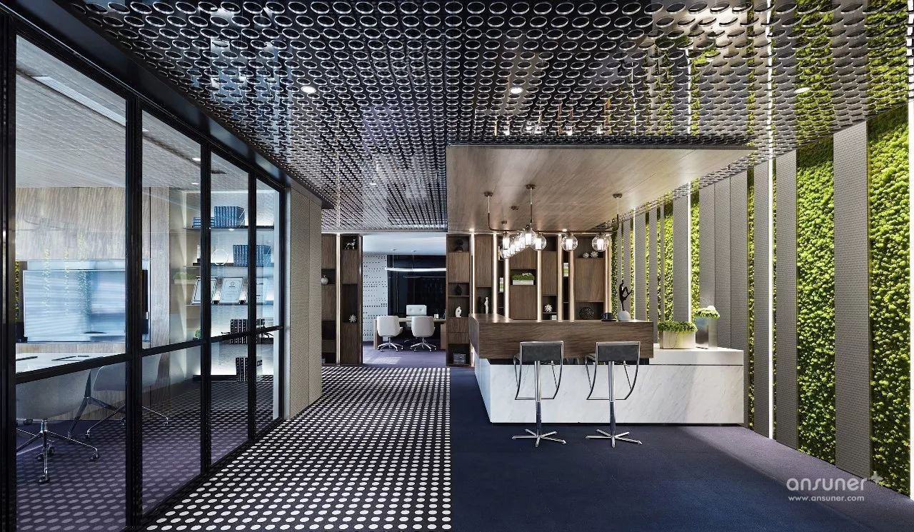 前厅区与会议区可重组转换为开敞空间,设置为可容纳多人的多功能活动厅。接待台与水吧结合体现新一代办公的开放性与体验性。