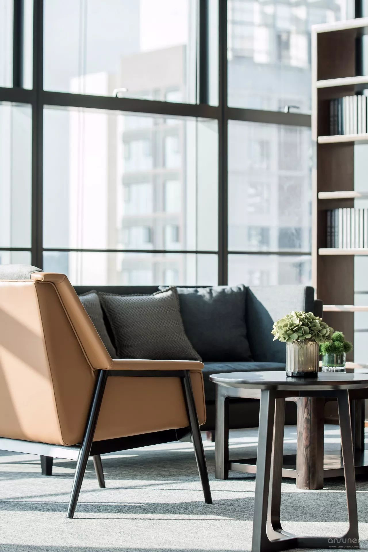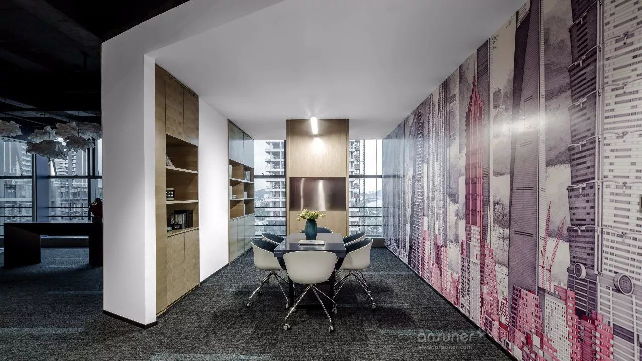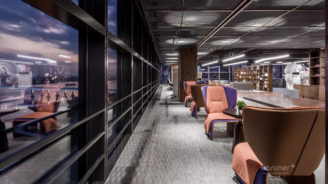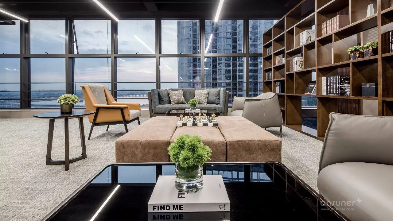 临江美景尽人眼帘,以书架进行自然切换,不同质地、色彩的座椅、沙发的组合不再强调位序,体现平等沟通、自然协作,以满足各种会议形式的需求,完成从我到我们的弹性交互。