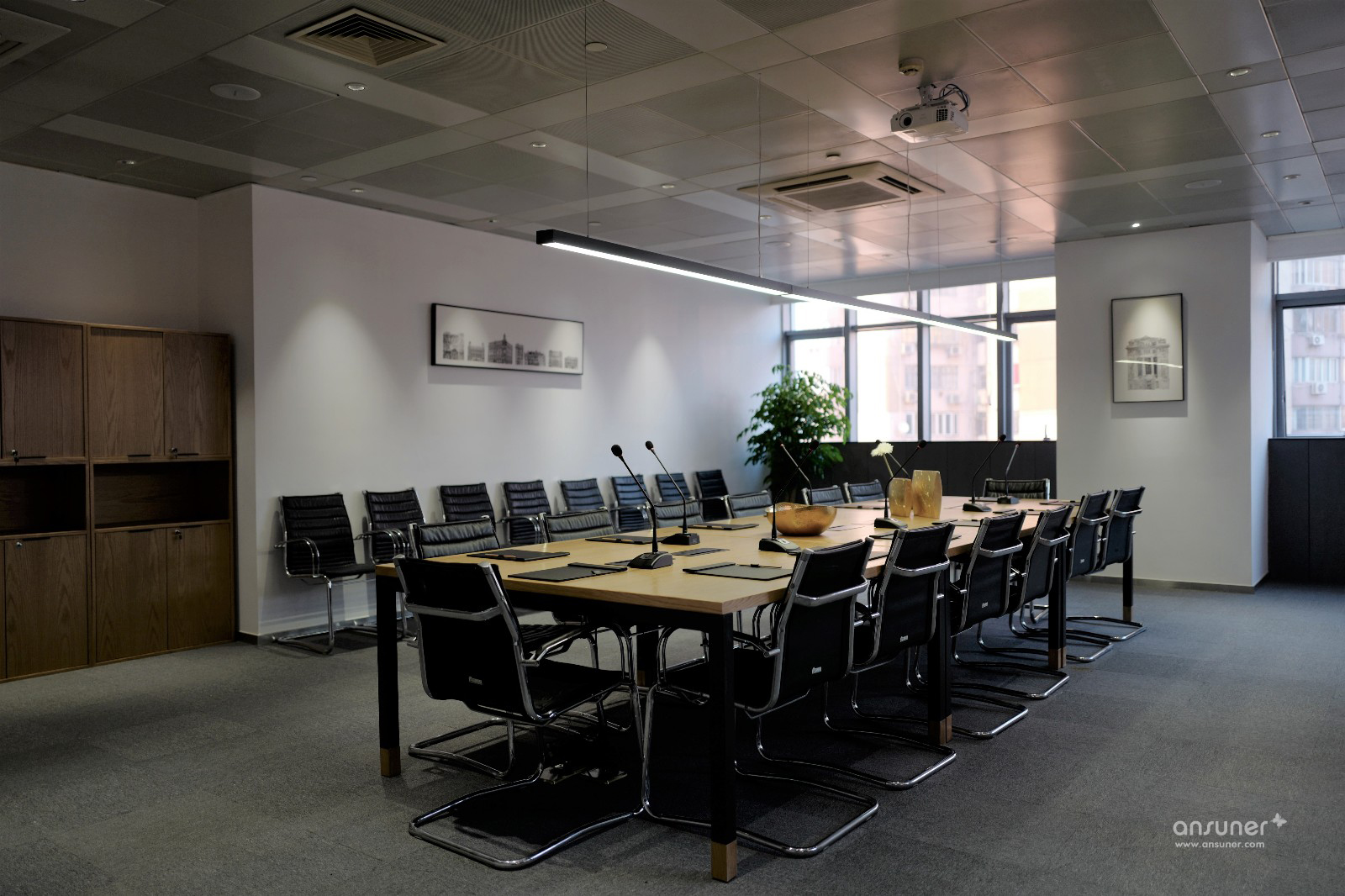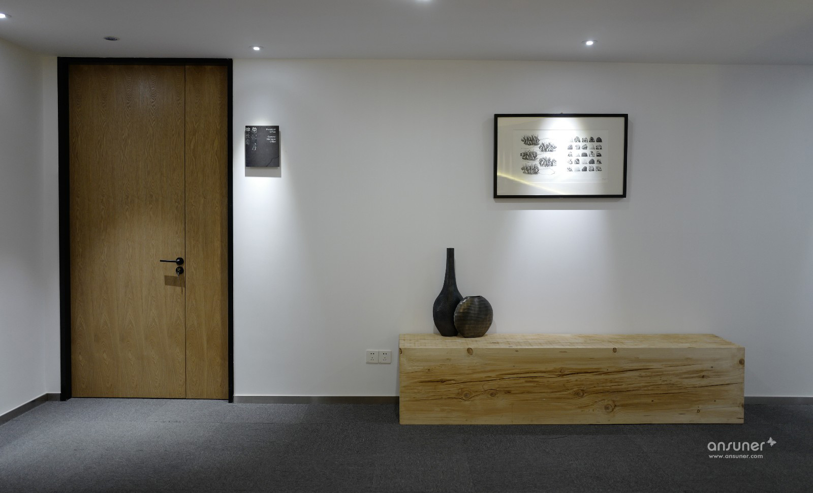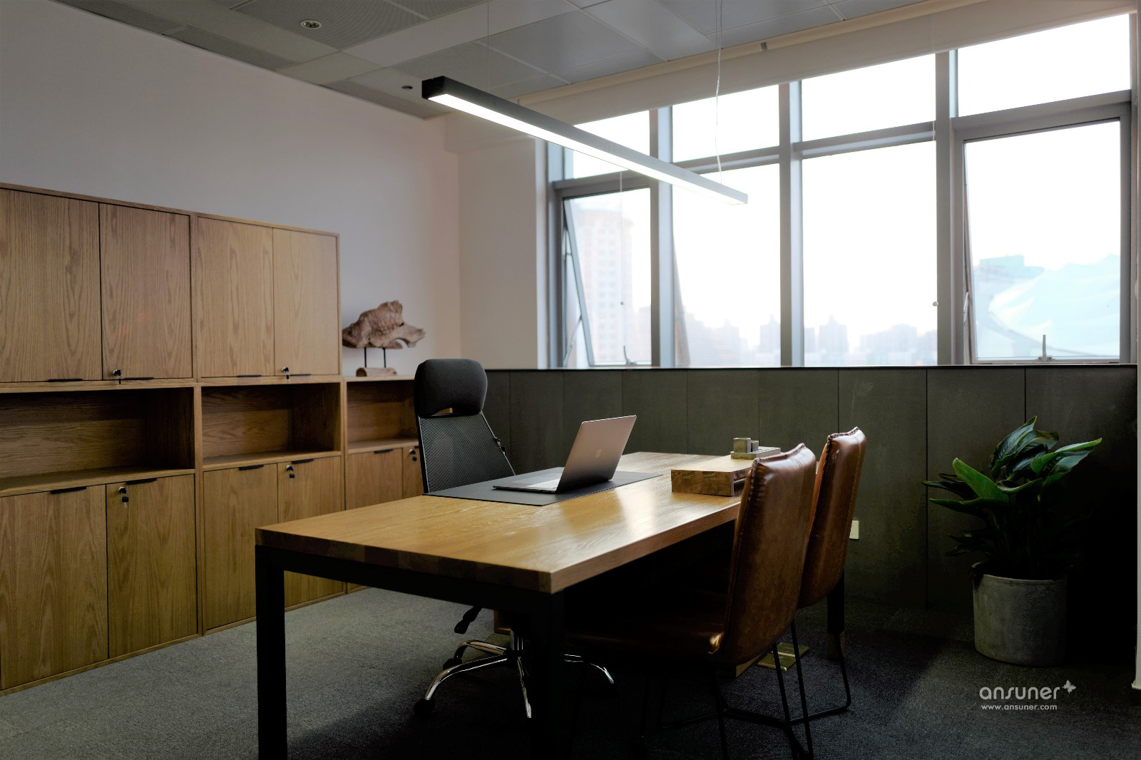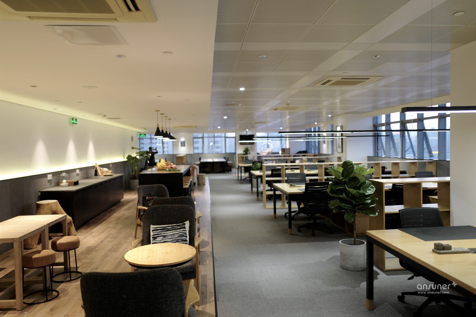 办公空间整体以暖灰色为基调,主材以黑铁、原木、木丝水泥板为主,辅以涂刷本白色乳胶漆的石膏板隔墙、深灰色阻燃块毯,配以4000k色温中性灯光,营造出宁静、平和的办公空间。