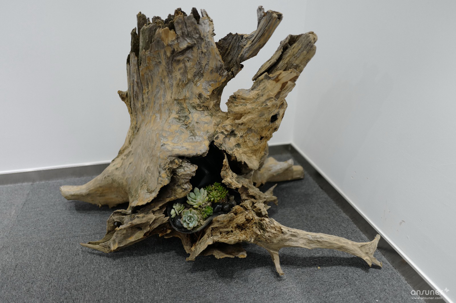 为了营造轻松的工作环境,除了休闲区的配置,设计师还专门到距离上海两百多公里的浙江农村,收罗老树根、老木料,加上定制的黑钢脚,制作成别具一格的茶几、长凳等家具。
