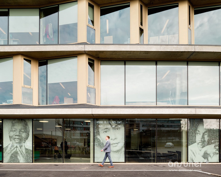在入口处,由激光切割制作的The Foundry标志贴在混凝土墙面上,移动玻璃门上贴着由山墙建筑演变而成的蓝色造型标注着“进”与“出”的标识。室内的房间编号采用同样的激光切割工艺直接贴在门板上,房门上的公司名称则是可以随时撤换的。窗框的表现形式以重复间隔的木制竖条加以修饰,与室内的楼梯造型遥相呼应。室内空间表现出服务的主题:关注人权。以世界历史从古至今影响深远的思想家与人权领导者的名句构成一个整体的空间故事,并将文字与人物以艺术的手法构筑整个空间氛围,以此映射本案独特的文化思潮。户外楼梯间的透明墙体上装饰着醒目的黑色金属文字,昭告着人们此处的属性。以著名人物马丁路德金、昂山素姬、曼德拉和亚伯拉罕林肯等一系列超大肖像图形,装饰于一楼的会议室玻璃窗上。每个肖像均以其所说的言论以文字图形塑造。